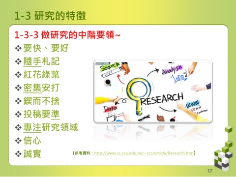 1-3 研究的特徵 1-3-3 做研究的中階要領~ 要快、要好 隨手札記 紅花綠葉 密集安打 鍥而不捨 投稿要準 專注研究領域 信心 誠實 (參考資料:http://www.cs.ccu.edu.tw/~ccc/article/Research.htm) 17