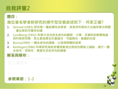 1. Grinnel (1993) 研究是一種結構性的探索,其使用科學的方法論來解決問題