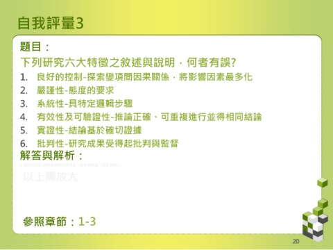 自我評量3 題目: 下列研究六大特徵之敘述與說明,何者有誤? 1. 良好的控制-探索變項間因果關係,將影響因素最多化 2. 嚴謹性-態度的要求 3. 系統性-具特定邏輯步驟 4. 有效性及可驗證性-推論正確、可重複進行並得相同結論 5. 實證性-結論基於確切證據 6. 批判性-研究成果受得起批判與監督 解答與解析: 1 良好的控制-探索變項間因果關係,將影響因素「減低到最小」 以上需放大 參照章節:1-3 20