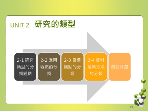 UNIT 2 研究的類型 2-1 研究 2-2 應用 2-3 目標 2-4 資料 類型的分 觀點的分 觀點的分 蒐集方法 自我評量 類觀點 類 類 的分類 21
