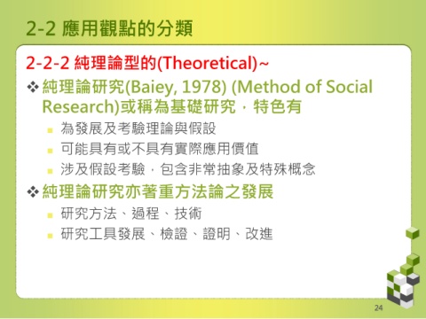 2-2 應用觀點的分類 2-2-2 純理論型的(Theoretical)~ 純理論研究(Baiey, 1978) (Method of Social Research)或稱為基礎研究,特色有 為發展及考驗理論與假設 可能具有或不具有實際應用價值 涉及假設考驗,包含非常抽象及特殊概念 純理論研究亦著重方法論之發展 研究方法、過程、技術 研究工具發展、檢證、證明、改進 24