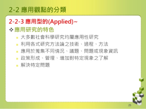 2-2 應用觀點的分類 2-2-3 應用型的(Applied)~ 應用研究的特色 大多數社會科學研究均屬應用性研究 利用各式研究方法論之技術、過程、方法 應用於蒐集不同情況、議題、問題或現象資訊 政策形成、管理、增加對特定現象之了解 解決特定問題 25