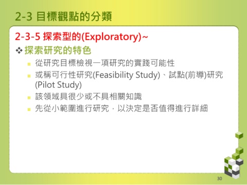 2-3 目標觀點的分類 2-3-5 探索型的(Exploratory)~ 探索研究的特色 從研究目標檢視一項研究的實踐可能性 或稱可行性研究(Feasibility Study)、試點(前導)研究 (Pilot Study) 該領域具很少或不具相關知識 先從小範圍進行研究,以決定是否值得進行詳細 30
