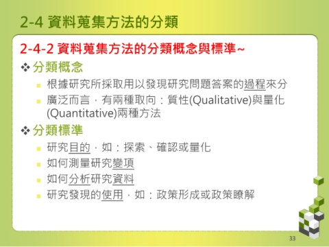 2-4 資料蒐集方法的分類 2-4-2 資料蒐集方法的分類概念與標準~ 分類概念 根據研究所採取用以發現研究問題答案的過程來分 廣泛而言,有兩種取向:質性(Qualitative)與量化 (Quantitative)兩種方法 分類標準 研究目的,如:探索、確認或量化 如何測量研究變項 如何分析研究資料 研究發現的使用,如:政策形成或政策瞭解 33