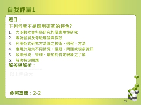 自我評量1 題目: 下列何者不是應用研究的特色? 1. 大多數社會科學研究均屬應用性研究 2. 專為發展及考驗理論與假設 3. 利用各式研究方法論之技術、過程、方法 4. 應用於蒐集不同情況、議題、問題或現象資訊 5. 政策形成、管理、增加對特定現象之了解 6. 解決特定問題 解答與解析: 2 為發展及考驗理論與假設,是理論型研究的特色 以上需放大 參照章節:2-2 35