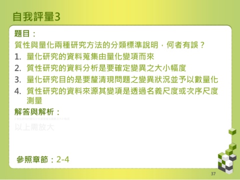 自我評量3 題目: 質性與量化兩種研究方法的分類標準說明,何者有誤? 1. 量化研究的資料蒐集由量化變項而來 2. 質性研究的資料分析是要確定變異之大小幅度 3. 量化研究目的是要釐清現問題之變異狀況並予以數量化 4. 質性研究的資料來源其變項是透過名義尺度或次序尺度 測量 解答與解析: 2 量化研究的資料分析是要確定變異之大小幅度 以上需放大 參照章節:2-4 37