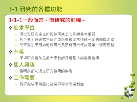 3-1 研究的各種功能 3-1-1一般而言,做研究的動機~ 追求學位 碩士班研究生在如何做研究上的訓練非常重要 甚至博士班研究生研究成果會被要求須達一定的國際水準 故研究生學習如何做研究及撰寫研究報告是第一學習要務 升等 學術研究著作是最大學教師升遷基本的審查指標 個人興趣 發明家都沈浸在研究發明的樂趣 工作需要 將研究成果商品化為業界帶來商業利益 39