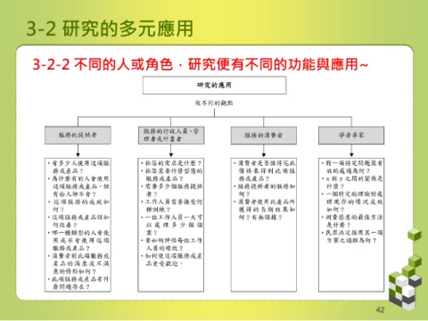3-2 研究的多元應用 3-2-2 不同的人或角色,研究便有不同的功能與應用~ 42