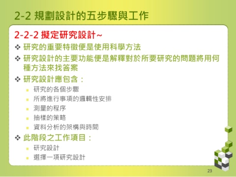 2-2 規劃設計的五步驟與工作 2-2-2 擬定研究設計~ 研究的重要特徵便是使用科學方法 研究設計的主要功能便是解釋對於所要研究的問題將用何 種方法來找答案 研究設計應包含: 研究的各個步驟 所將進行事項的邏輯性安排 測量的程序 抽樣的策略 資料分析的架構與時間 此階段之工作項目: 研究設計 選擇一項研究設計 23