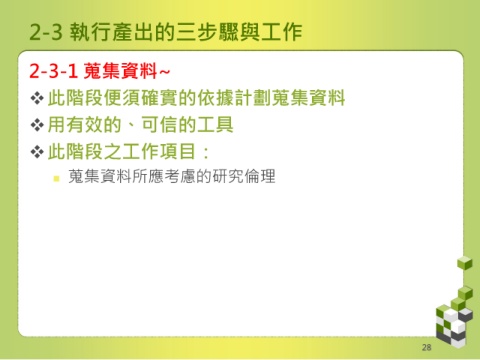 2-3 執行產出的三步驟與工作 2-3-1 蒐集資料~ 此階段便須確實的依據計劃蒐集資料 用有效的、可信的工具 此階段之工作項目: 蒐集資料所應考慮的研究倫理 28
