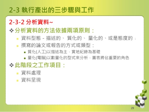 2-3 執行產出的三步驟與工作 2-3-2 分析資料~ 分析資料的方法依據兩項原則: 資料型態-描述的、 質化的、 量化的、或是態度的﹔ 撰寫的論文或報告的方式或類型: 質化(人工)以描述為主,實地紀錄為基礎 量化(電腦)以數量化的型式來分析,圖表將佔重要的角色 此階段之工作項目: 資料處理 資料呈現 29