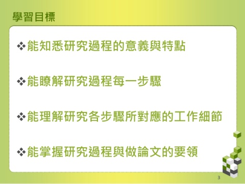 學習目標 能知悉研究過程的意義與特點 能瞭解研究過程每一步驟 能理解研究各步驟所對應的工作細節 能掌握研究過程與做論文的要領 3