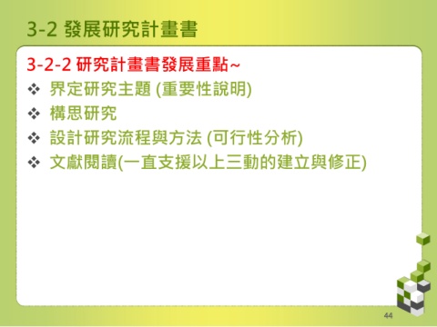 3-2 發展研究計畫書 3-2-2 研究計畫書發展重點~ 界定研究主題 (重要性說明) 構思研究 設計研究流程與方法 (可行性分析) 文獻閱讀(一直支援以上三動的建立與修正) 44