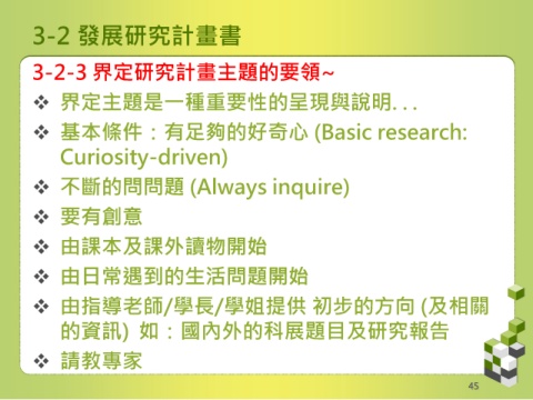 3-2 發展研究計畫書 3-2-3 界定研究計畫主題的要領~ 界定主題是一種重要性的呈現與說明. . . 基本條件:有足夠的好奇心 (Basic research: Curiosity-driven) 不斷的問問題 (Always inquire) 要有創意 由課本及課外讀物開始 由日常遇到的生活問題開始 由指導老師/學長/學姐提供 初步的方向 (及相關 的資訊) 如:國內外的科展題目及研究報告 請教專家 45