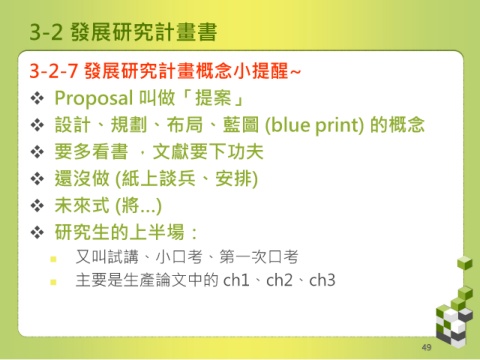 3-2 發展研究計畫書 3-2-7 發展研究計畫概念小提醒~ Proposal 叫做「提案」 設計、規劃、布局、藍圖 (blue print) 的概念 要多看書 ,文獻要下功夫 還沒做 (紙上談兵、安排) 未來式 (將…) 研究生的上半場: 又叫試講、小口考、第一次口考 主要是生產論文中的 ch1、ch2、ch3 49