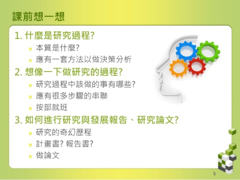 課前想一想 1. 什麼是研究過程? 本質是什麼? 應有一套方法以做決策分析 2. 想像一下做研究的過程? 研究過程中該做的事有哪些? 應有很多步驟的串聯 按部就班 3. 如何進行研究與發展報告、研究論文? 研究的奇幻歷程 計畫書? 報告書? 做論文 5