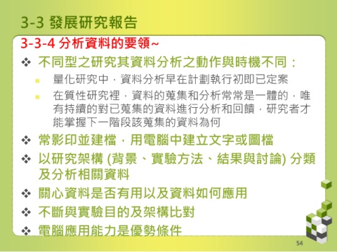 3-3 發展研究報告 3-3-4 分析資料的要領~ 不同型之研究其資料分析之動作與時機不同: 量化研究中,資料分析早在計劃執行初即已定案 在質性研究裡,資料的蒐集和分析常常是一體的,唯 有持續的對已蒐集的資料進行分析和回饋,研究者才 能掌握下一階段該蒐集的資料為何 常影印並建檔,用電腦中建立文字或圖檔 以研究架構 (背景、實驗方法、結果與討論) 分類 及分析相關資料 關心資料是否有用以及資料如何應用 不斷與實驗目的及架構比對 電腦應用能力是優勢條件 54