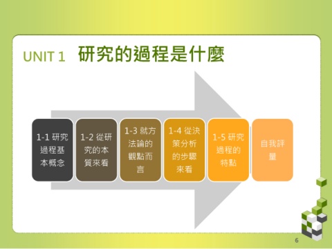 UNIT 1 研究的過程是什麼 1-3 就方 1-4 從決 1-1 研究 1-2 從研 法論的 策分析 1-5 研究 自我評 過程基 究的本 觀點而 的步驟 過程的 量 本概念 質來看 特點 言 來看 6