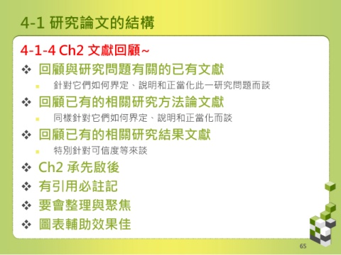 4-1 研究論文的結構 4-1-4 Ch2 文獻回顧~ 回顧與研究問題有關的已有文獻 針對它們如何界定、說明和正當化此一研究問題而談 回顧已有的相關研究方法論文獻 同樣針對它們如何界定、說明和正當化而談 回顧已有的相關研究結果文獻 特別針對可信度等來談 Ch2 承先啟後 有引用必註記 要會整理與聚焦 圖表輔助效果佳 65