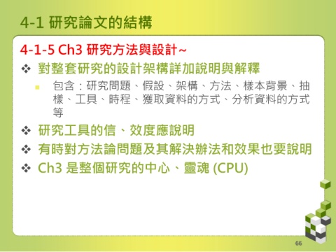 4-1 研究論文的結構 4-1-5 Ch3 研究方法與設計~ 對整套研究的設計架構詳加說明與解釋 包含:研究問題、假設、架構、方法、樣本背景、抽 樣、工具、時程、獲取資料的方式、分析資料的方式 等 研究工具的信、效度應說明 有時對方法論問題及其解決辦法和效果也要說明 Ch3 是整個研究的中心、靈魂 (CPU) 66