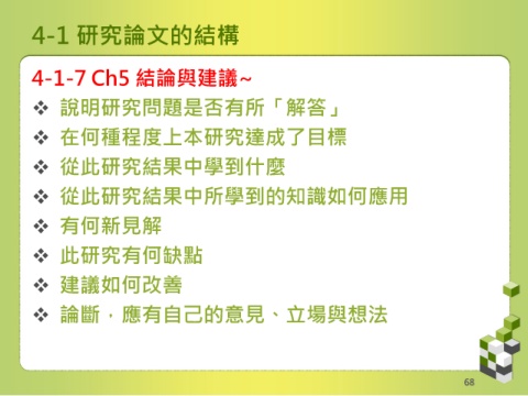 4-1 研究論文的結構 4-1-7 Ch5 結論與建議~ 說明研究問題是否有所「解答」 在何種程度上本研究達成了目標 從此研究結果中學到什麼 從此研究結果中所學到的知識如何應用 有何新見解 此研究有何缺點 建議如何改善 論斷,應有自己的意見、立場與想法 68