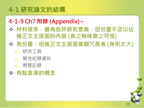 4-1 研究論文的結構 4-1-9 Ch7 附錄 (Appendix)~ 材料很多,雖有些許研究意義,但份量不足以佔 據正文主版面的內容 (食之無味棄之可惜) 有份量,但進正文主版面會顯冗長者 (身形太大) 研究工具 質性紀錄資料 歷程記錄 有點倉庫的概念 70