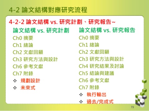 4-2 論文結構對應研究流程 4-2-2 論文結構 vs. 研究計劃、研究報告~ 論文結構 vs. 研究計劃 論文結構 vs. 研究報告 Ch0 摘要 Ch0 摘要 Ch1 緒論 Ch1 緒論 Ch2 文獻回顧 Ch2 文獻回顧 Ch3 研究方法與設計 Ch3 研究方法與設計 Ch6 參考文獻 Ch4 研究結果及討論 Ch7 附錄 Ch5 結論與建議 規劃設計 Ch6 參考文獻 未來式 Ch7 附錄 執行輸出 過去/完成式 73
