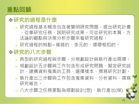 研究過程基本概念包含著闡明研究問題、提出研究計畫