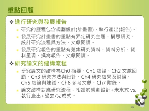 研究的歷程包含規劃設計(計畫書)、執行產出(報告)。