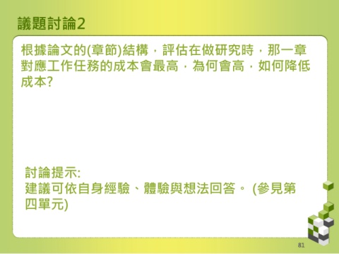 議題討論2 根據論文的(章節)結構,評估在做研究時,那一章 對應工作任務的成本會最高,為何會高,如何降低 成本? 討論提示: 建議可依自身經驗、體驗與想法回答。 (參見第 四單元) 81